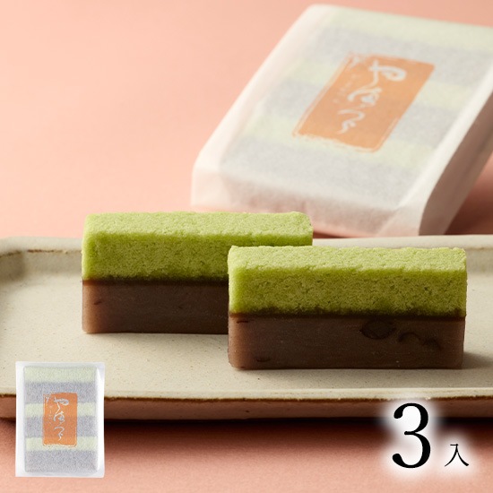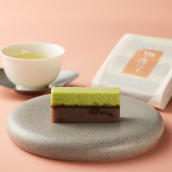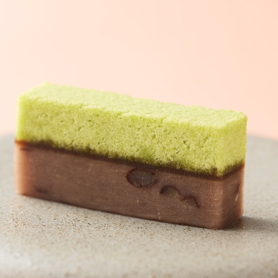 小豆の皮むき餡を使った東雲づくりの餡の上に、黒糖羊羹を流し、薄緑色に染めた餡そぼろ(叢雨生地)の3層仕立ての和菓子。