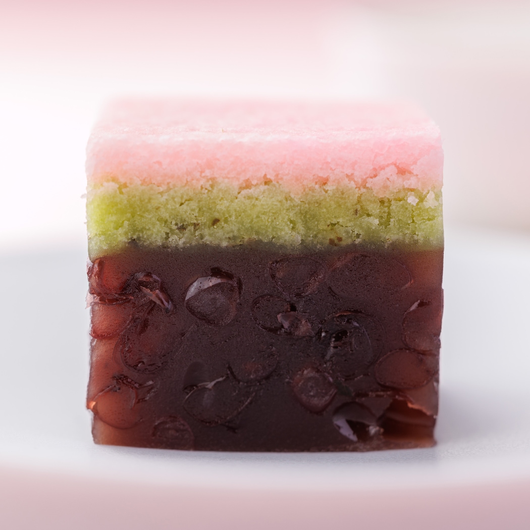 三層それぞれの味わいが調和した、やさしい甘さの和菓子です。