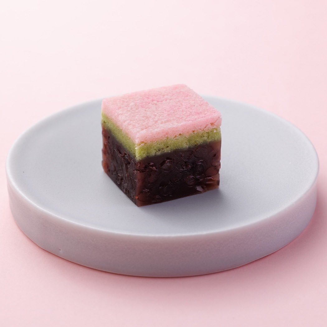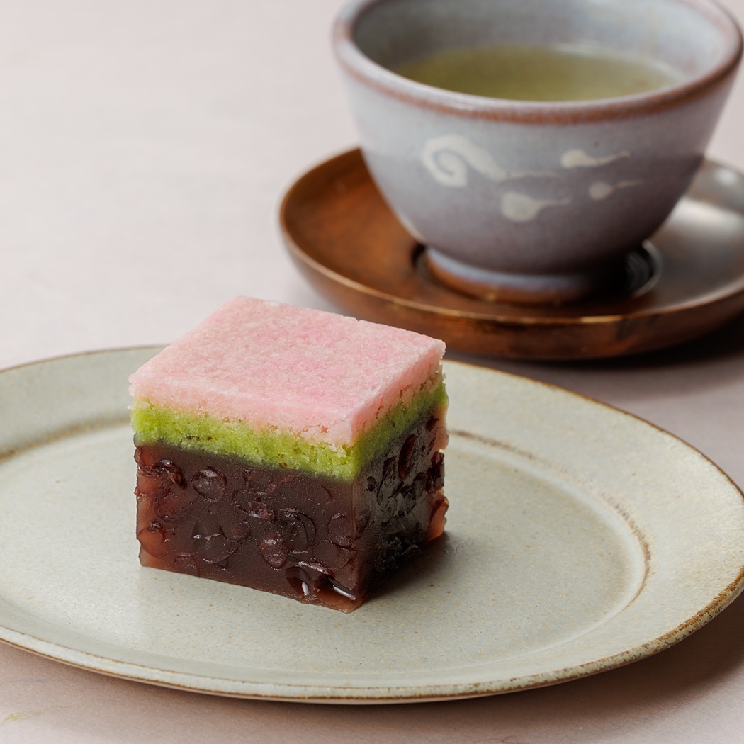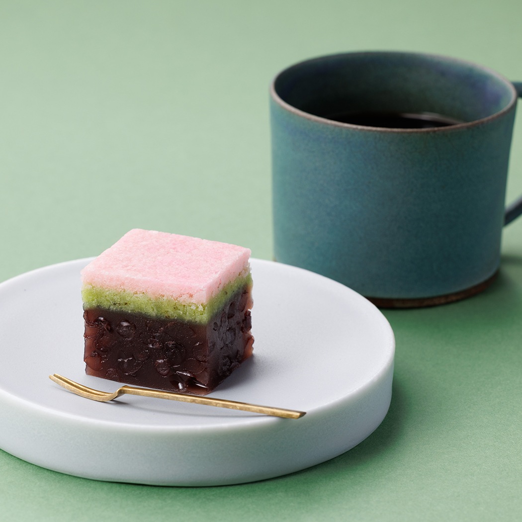 桜葉を練り込んだ淡い色合いのそぼろ餡に、粒あんの羊羹を重ねた三層仕立ての棹菓子。粒あんの食感と風味、そぼろ餡の柔らかい口当たりと桜の香り、さまざまな魅力を楽しめる春の羊羹です。