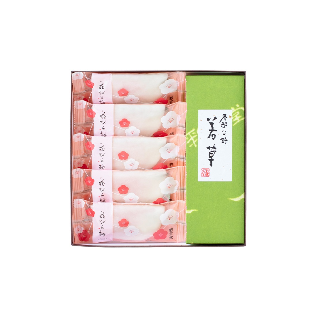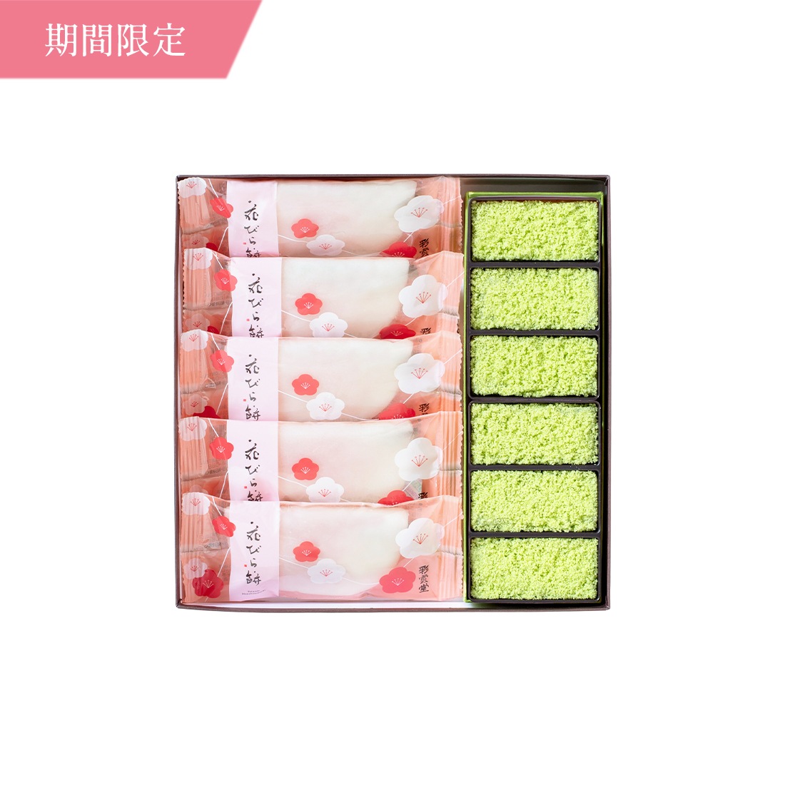 | 原材料名 | 【花びら餅】砂糖(国内製造)、米粉、ごぼう甘露煮、麦芽糖、手芒豆、水飴、白味噌(大豆を含む)、卵白(卵を含む)、砂糖結合水飴、澱粉/トレハロース、酵素、着色料(赤3、赤106、黄5) 【若草】砂糖(国内製造)、米、麦芽糖、砂糖結合水飴、米粉、水飴/着色料(黄4、黄5、青1) |