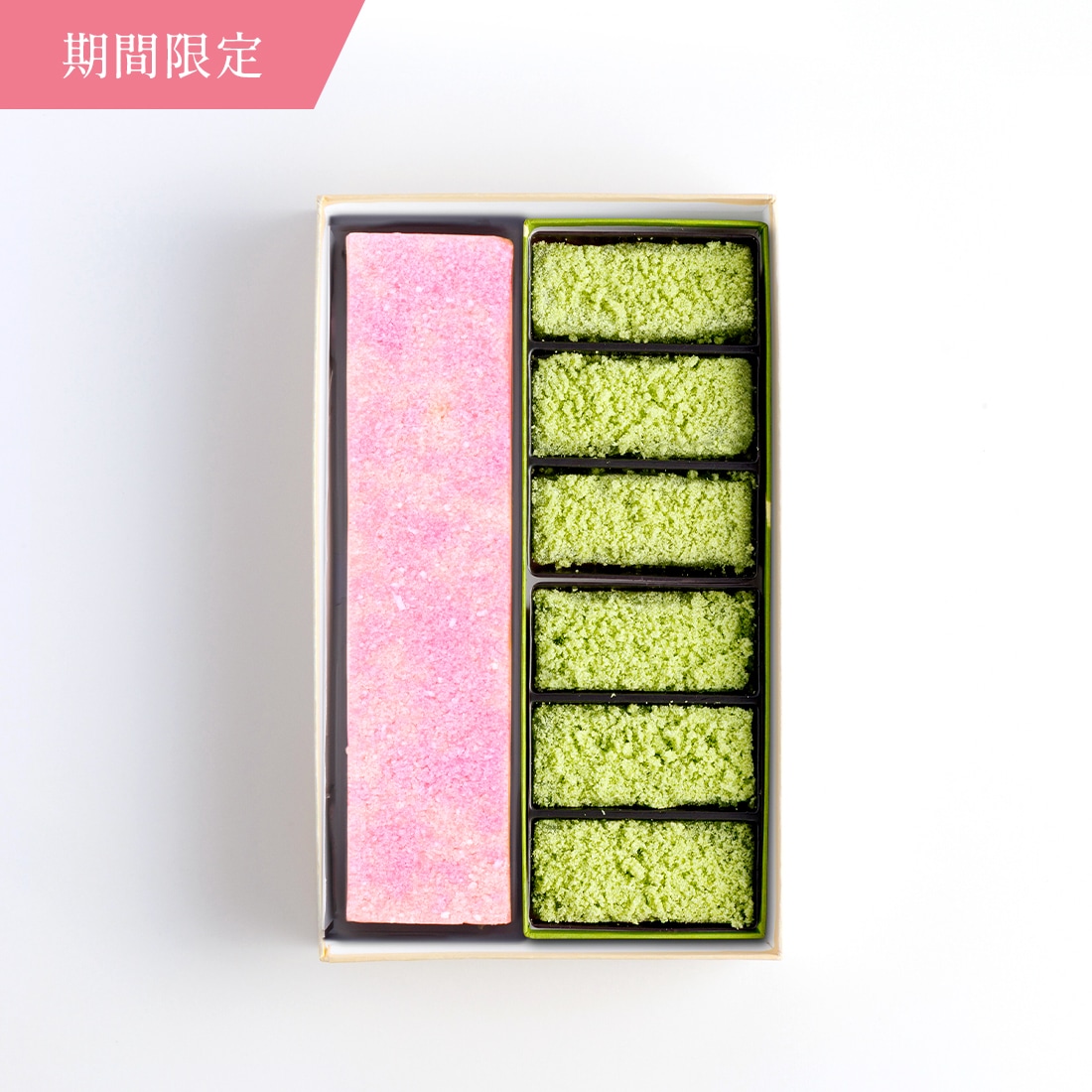 | 原材料名 | 【若草】砂糖(国内製造)、手芒豆、小豆、水飴、米粉、寒天、麦芽糖、澱粉、還元水飴/トレハロース、炭酸カルシウム、着色料(赤3、赤106、黄4、黄5、青1) 【花の雲】砂糖(国内製造)、小豆、手芒豆、米粉、桜葉塩漬、寒天/トレハロース、膨張剤、着色料(赤3、赤106、黄4、黄5、青1) |
