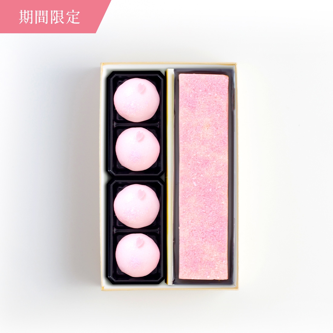 | 原材料名 | 【花の雲】 砂糖(国内製造)、小豆、手芒豆、米粉、桜葉塩漬、寒天/トレハロース、膨張剤、着色料(赤3、赤106、黄4、黄5、青1) 【はな桜】つくね芋ペースト(山芋を含む、国内製造)、砂糖、手芒豆、米粉、還元水飴、桜葉塩漬、寒天、澱粉/トレハロース、炭酸カルシウム、着色料(クチナシ) |