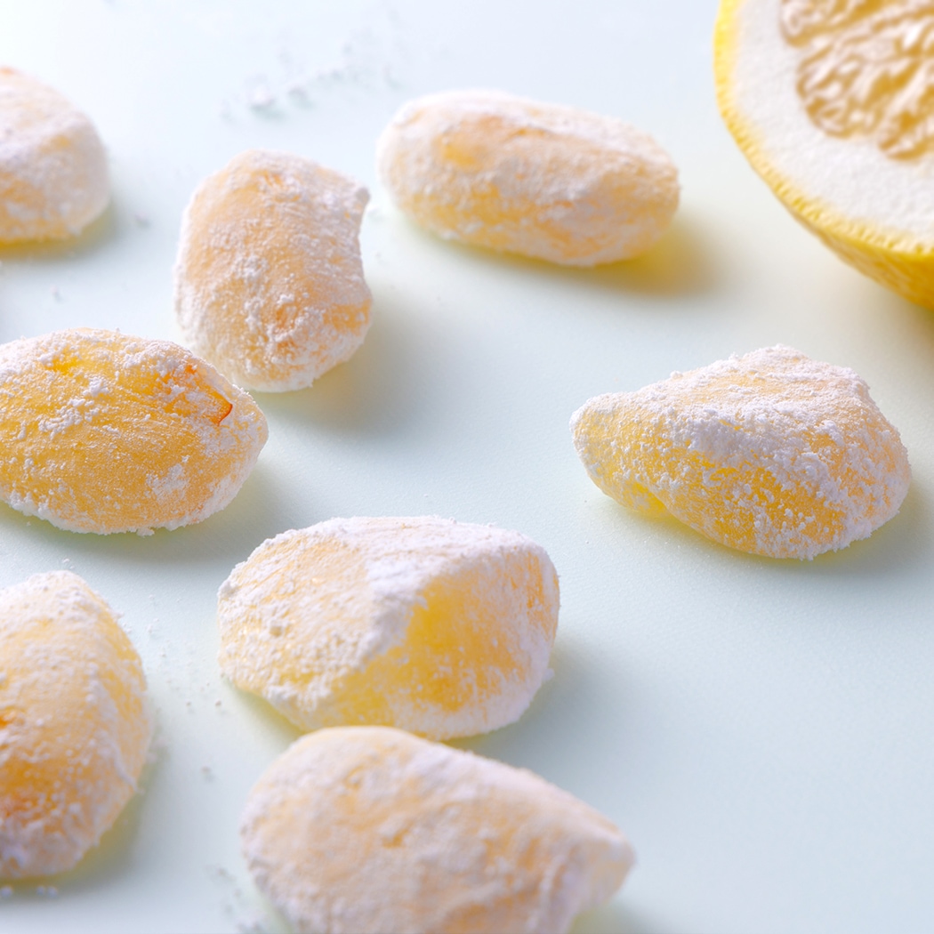 山口県産の夏蜜柑を求肥に練り込み、ひとくちサイズに仕上げました。さわやかな酸味と、夏蜜柑の皮の食感がやみつきになる餅菓子です。映画を観ながら、勉強をしながら、いろんな生活シーンに合わせやすい、おやつ和菓子です。