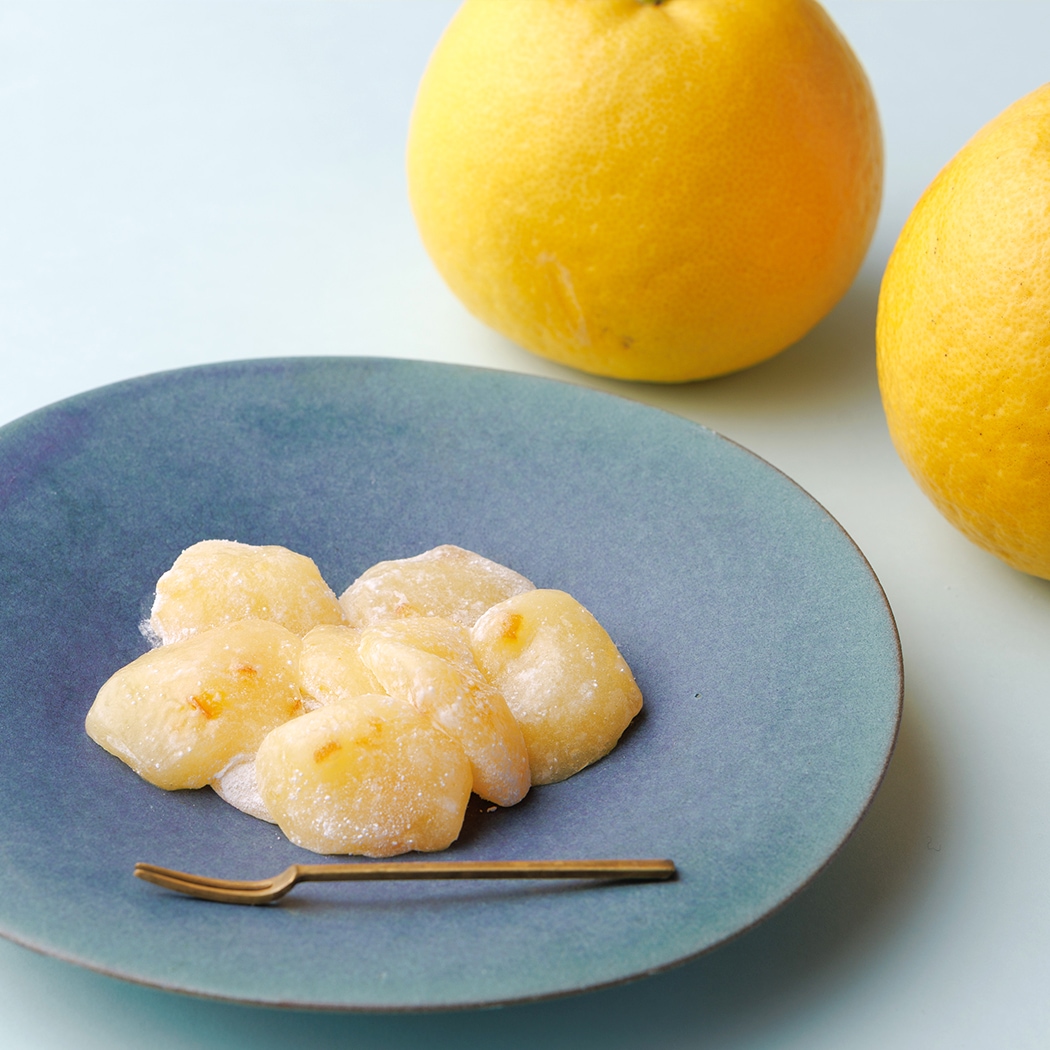 山口県産の夏蜜柑を求肥に練り込み、ひとくちサイズに仕上げました。さわやかな酸味と、夏蜜柑の皮の食感がやみつきになる餅菓子です。映画を観ながら、勉強をしながら、いろんな生活シーンに合わせやすい、おやつ和菓子です。