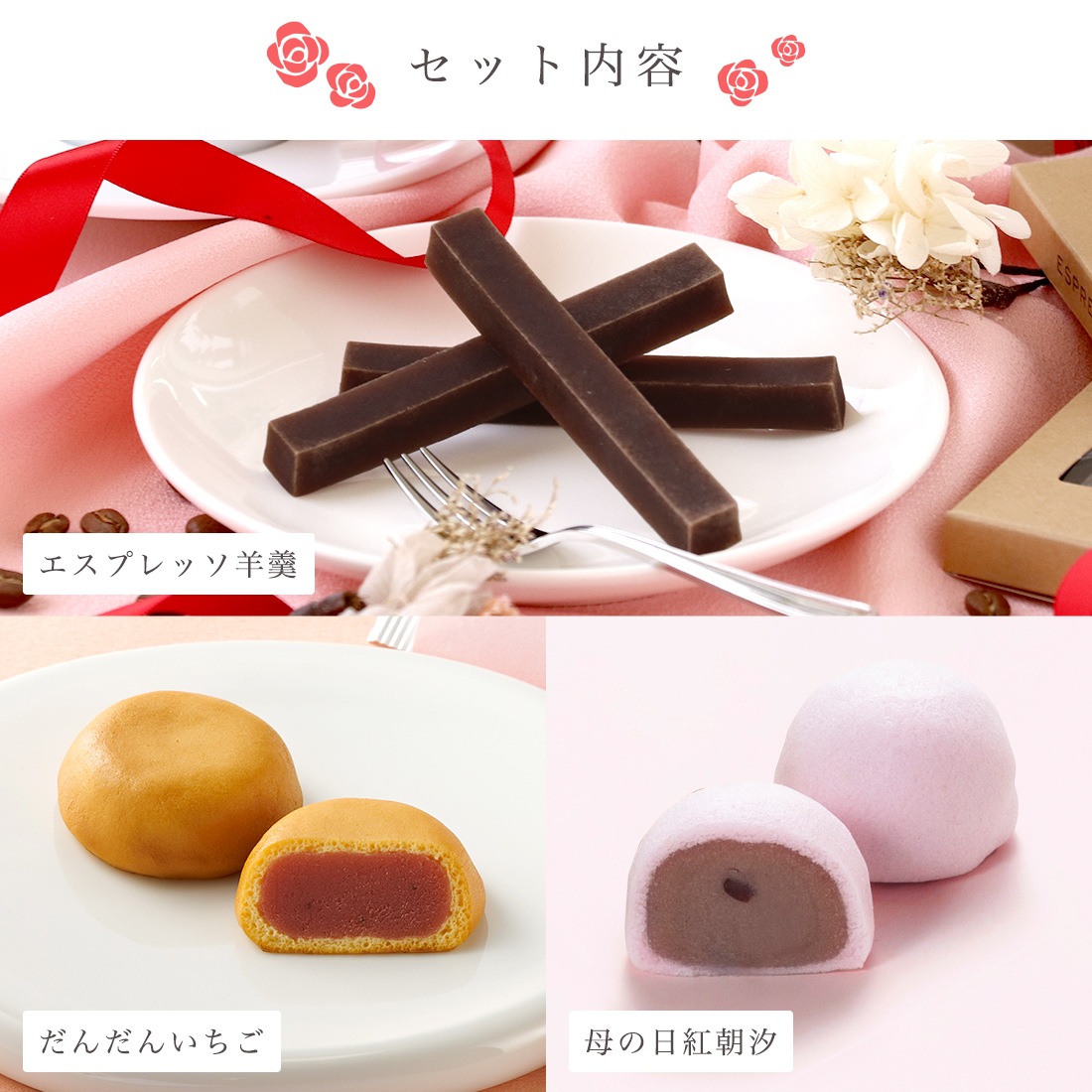 エスプレッソ羊羹4本入、だんだんいちご2個、母の日紅朝汐2個入を詰め合わせた母の日限定ギフトです。